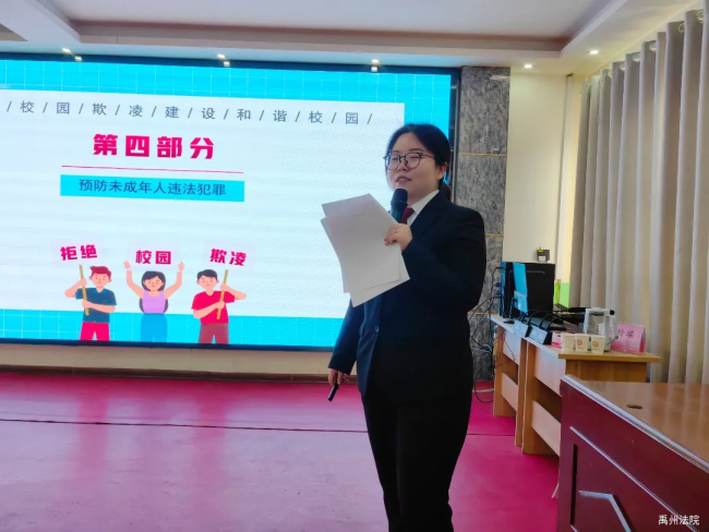 活动中,刑庭法官助理马雯苧围绕校园防欺凌与防性侵两方面内容,结合近几年发生的涉未成年人犯罪典型案例,为该校252名六年级学生送上了精彩普法课,引导同学们树立法治观念,不参与、不畏惧校园霸凌,并告知如果涉嫌犯罪将面临的严重法律后果。