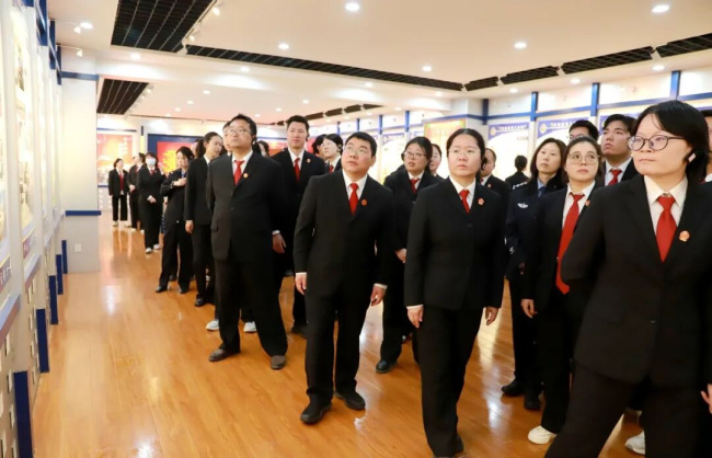 在监狱干警的引导下,法院干警们实地参观了服刑人员劳动改造车间、监舍和警示教育展厅,了解服刑改造人员的生活、生产情况,亲眼目睹高墙的森严和铁窗的冰冷,切身感受到自由的珍贵。